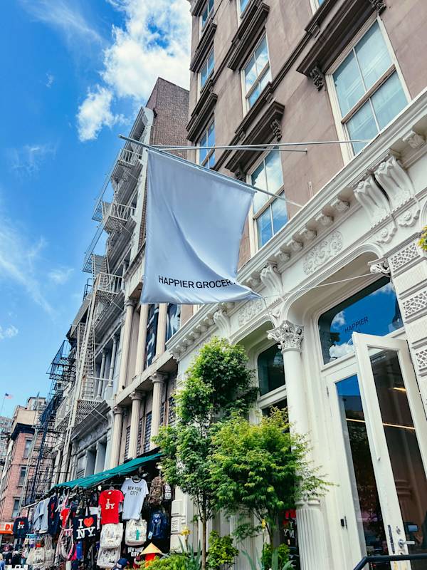 2023年、ソーホーのカナルストリート沿いにオープンした 「Happier Grocery(ハピアーグロッサリー)」 は、ロサンゼルスの高級グロッサリーストア 「EREWHON(エレウォン)」 のニューヨーク版。1階には新鮮なオーガニック野菜や高級食材、オリジナル商品が並び、奥のオープンキッチンではピザやお寿司が楽しめる。地下ではパントリー商品やスキンケア、オリジナルアパレルが揃う。ファッショナブルなソーホーの住民やZ世代に人気のこの店は、単なるグロッサリーストアを超えたプレミアム体験を提供している。運営するのは、カリブ海の高級ホテル 「Palm Heights(パームハイツ)」 を手掛ける Gabrielle Kahari(ガブリエル・カハリ)。ニューヨークの新しい注目スポットとして、多くの人々を魅了している。
