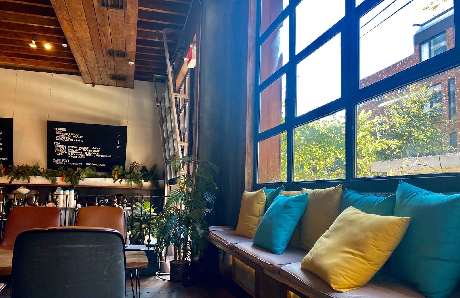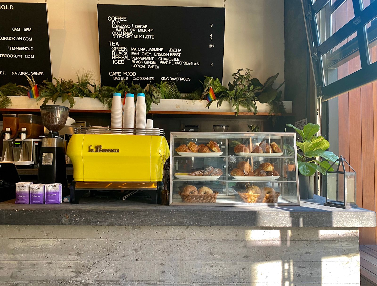 ナイトクラブとしてよく知られているFreehold。日中はリラックスしながら気楽に過ごせるカフェとして営業している。大きな窓から差し込む光が広い店内の雰囲気を暖め、白とウッドを基調とした内装がまるでカリフォルニアの様で気分をアップさせてくれる。座り心地のいい椅子にはカラフルなクッションがたくさん置いてあり、美味しいピザを食べながら友達や家族とゆったり気楽に過ごすことができる。テーブルは少し低めなので、作業をするには少し不向き。East River、Domino Park、Williamsburg Bridgeの美しい景色を眺められるエリアから1ブロックの場所にあるので、ショッピングや観光の合間におすすめ。